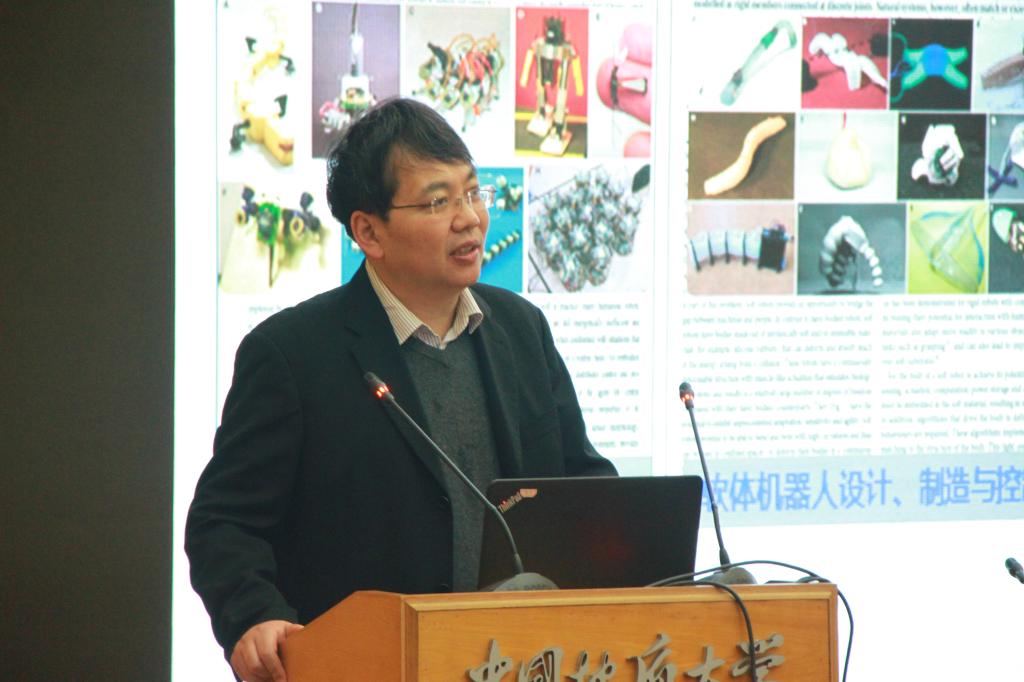报告围绕共融机器人(能够与作业环境、操作者和其他机器人之间自然交互,自主适应复杂任务和动态环境的人-机-环境共融的机器人)的基础理论与关键技术,从研究概况、产业发展情况、发展趋势等几个方面展开。丁院士作为NSFC共融机器人重大计划的指导专家组组长,从高校科研的角度对该计划进行介绍,展示了团队自助研制的风电叶片多机器人协同打磨装备,并与在座的师生分享了做科研的心得:做科研要坚持理论创新-技术突破-工程应用-产业引领的创新模式。